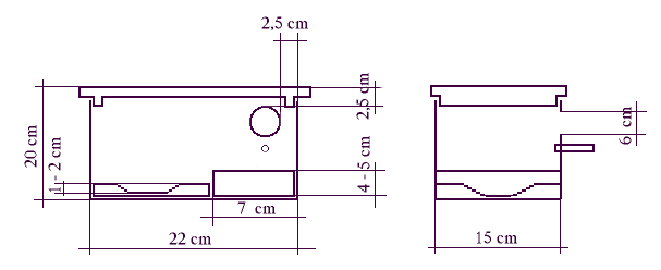 Sama jsem pro chov používala typ ležatý a je pravda, že právě proto zřejmě mláďata z posledního odchovu snadno vypadávala ( malá zmíňka o tom je zde ). Typ kompromisní by měl tento nedostatek odstranit. V literatuře se u tohoto typu uvádí průměr vletového otvoru 4,5 cm. Uvádím však 6 cm, jelikož si pamatuji, že jsme kdysi dávno sestrojovali budku a jedna samice se nám ve vletovém otvoru vzpříčila. Větší rezerva neškodí. Bidélko, které je nainstalováno pod vletovým otvorem, jsem ve své budce neměla, jelikož těsně u vletového otvoru bylo běžné bidélko a zcela plnilo svůj účel.